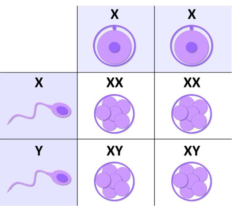 Si el embrión recibe un cromosoma X de su madre y otro cromosoma X de su padre, su sexo cromosómico será XX, es decir, hembra. Si recibe un cromosoma X de su madre y un cromosoma Y de su padre, su sexo cromosómico será XY, es decir, macho.